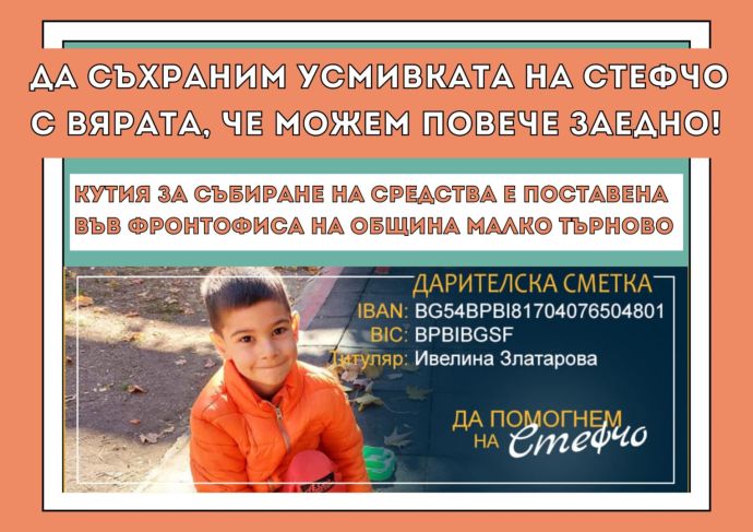 Аз ще помогна, надявам се и вие да го направите! Сигурен съм, че има шанс за него да тича с връстниците си отново... С този призив се обърна към местните хора кметът на Малко Търново Илиян Янчев в подкрепа на кампанията в помощ на 7-годишния Стефан Златаров, който има нужда от лечение.