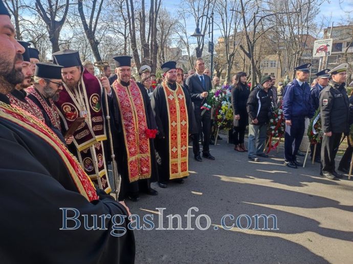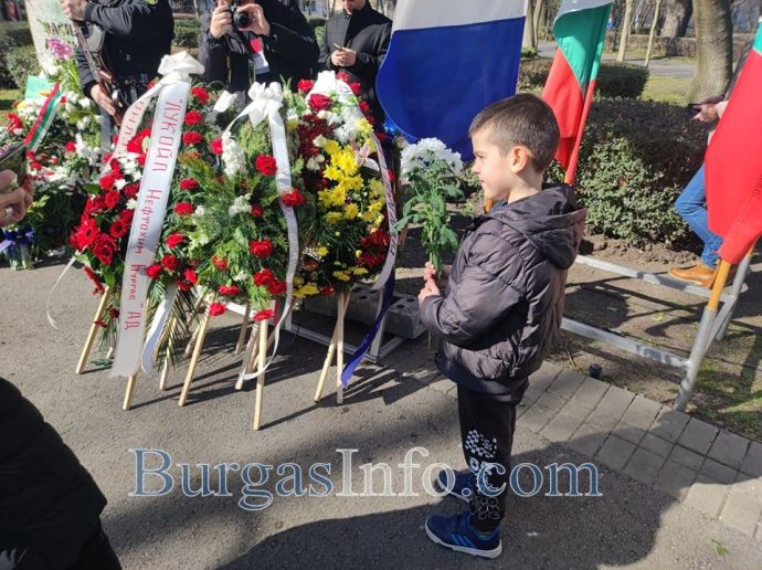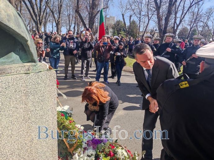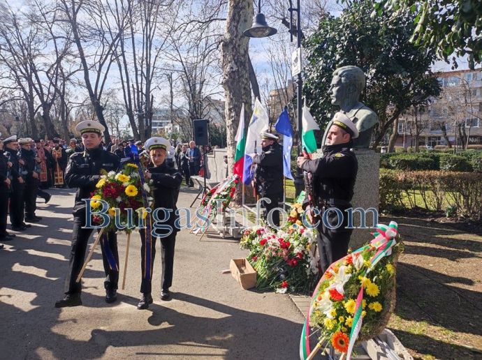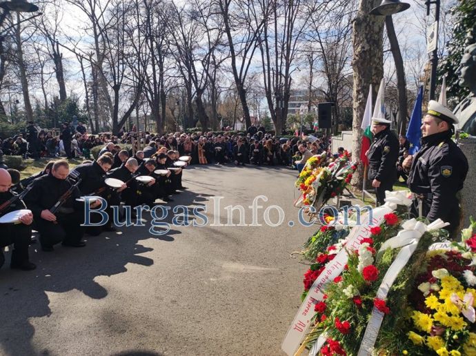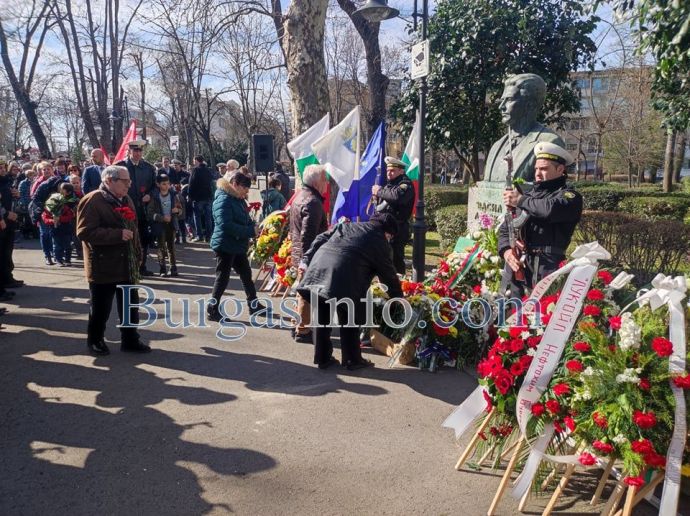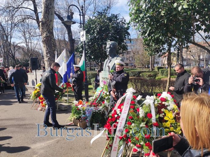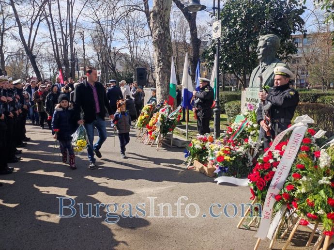 Венци и цветя отрупаха паметника на Васил Левски в Морската градина в Бургас днес, когато се навършват 150 годин от гибелта му. На тържествения ритуал присъстваха кметът Димитър Николов, областният управител Мария Нейкова, депутати от различни политически сили, общински съветници, представители на партии, обществени организации, учебни заведения, много граждани.