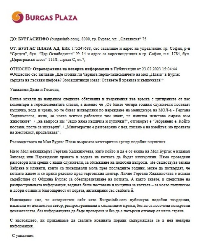 От мол "Бургас Плаза" изпратиха становище във връзка с котето Перла, чийто казус беше решен щастливо още в края на миналата седмица. Днес получихме опровержение, което публикуваме, без редакторска намеса. Ето го: