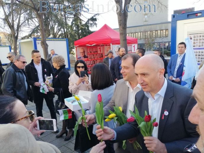 Като истински джентълмени Манол Тодоров, Стоян Грозев и техните колеги зарадваха дамите край информационния си пункт на Часовника с красиви лалета и им пожелаха хубав празник. А жените от листата подариха меденки с N15 и логото на „Български възход”.