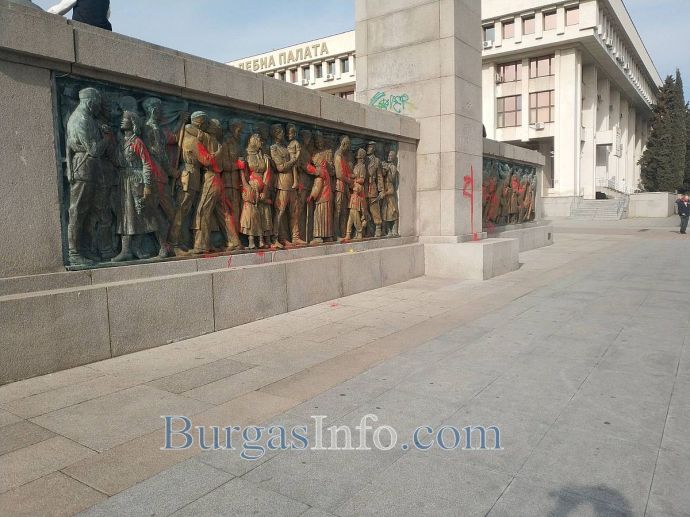 Пореден вандалски акт срещу Паметника на съветската армия на площад „Тройката” в Бургас. Тази сутрин монуметът осъмна оплискан с червена боя, разлята върху ръцете на съветските воини. А точно под надписа вечна признателност е изрисува символът Z.