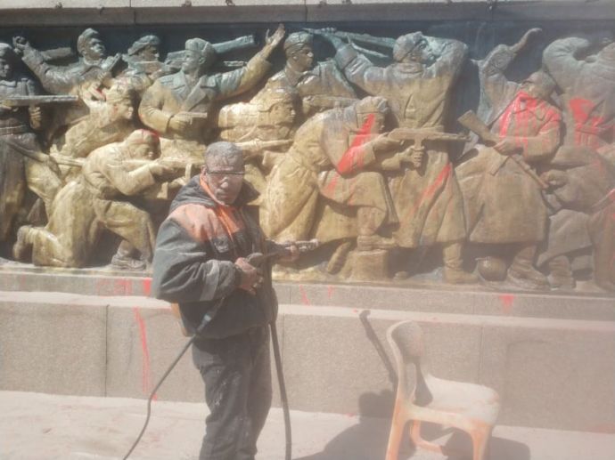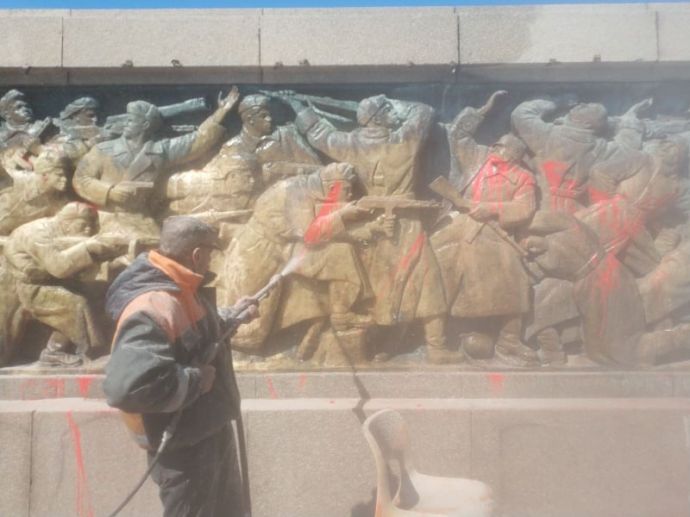 Служители на фирма „Нелсен Чистота“ почистваха днес от червената боя паметника на Съветската армия, известен като Альоша, в центъра на Бургас. Монументът осъмна залят преди няколко дни. Днес боята беше премахвана с кварцов пясък под високо налягане. Неколцина минувачи, които станаха свидетели на почистването, се възмутиха на това и се заканиха, че пак ще бъде нацапан. До напрежение не се стигна и работниците продължиха дейността си спокойно.