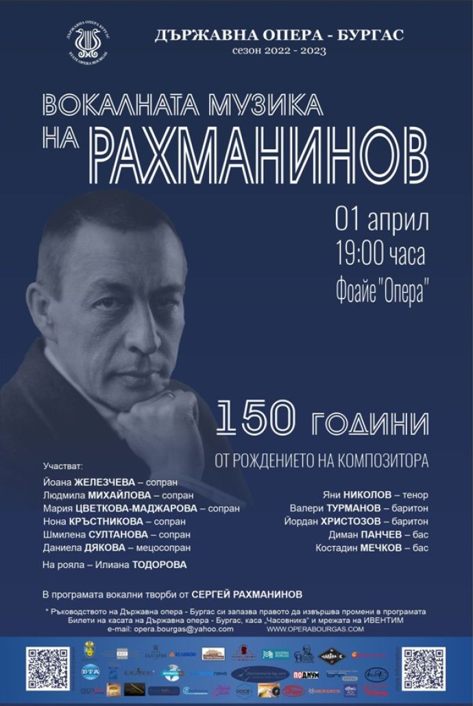 Точно в деня, в който големият композитор, пианист и диригент, ярък представител на късния руски романтизъм – Сергей Рахманинов, е роден преди 150 години – 1‐ви април, събота, Бургаската опера е подготвила концерт с негови творби – „Вокалното творчество на Рахманинов“, в изпълнение на солисти на крайморския културен институт. Композиторът с руски корени, починал на 28 март 1943 г. в САЩ, е възприеман като проникновен художник на пасторални природни картини и вещ психолог, надникващ в тайнствата на душата. В творчеството му, силно повлияно от неговия кумир П. И. Чайковски и композиторите от „Могъщата петорка“ /Балакирев, Бородин, Кюи, Мусоргски, Римски-Корсаков/, съжителстват в прелестна симбиоза страстните пориви и поетическата съзерцателност, мрачните нюанси на трагизма и жизнеутвърждаващата патетика. В музиката на Рахманинов се съчетават вещо полифонични мелодии, които носят цялостно внушение и извайват единна красота на форма и възприятие.