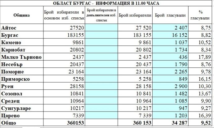 9,53% от имащите право на глас в Бургаска област са дали своя вот към 11 часа, сочат данните на Районната избирателна комисия. Най-висока е активността в Малко Търново - 17,89%, а най-ниска - в Карнобат. Вижте цифрите в таблицата.