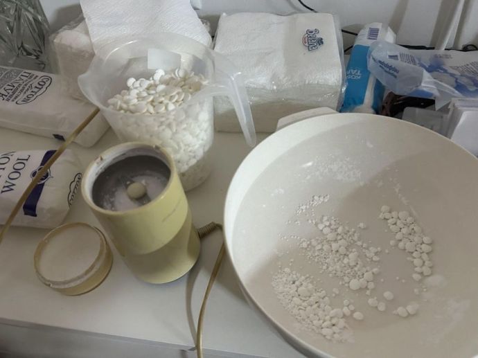 Задържаните са 52-годишен криминално проявен и осъждан мъж от село Ведрово, община Сунгурларе, 43-годишна жена от Поморие и 29-годишен криминално проявен и осъждан помориец. Установено е, че в апартамента има лаборатория за производство и пакетиране на синтетичен високорисков наркотик - метамфетамин. Намерени и иззети са различни прекурсори : кутии с червен фосфор, два литра йод, осем литра разредител, памуци, фунии, короселин, 15 килограма натриева основа на перли, филтрираща система от пластмасови тръбички, 14 литра кореселин, четири бутилки с около 4,5 литра течен ефедрин, електронна везна и др., както и кафява криталобразна каша с вместимост около 95 литра и над 16 500 бели хапчета. Освен прекурсорите са открити бели, розови и жълти кристалобразни вещества, пакетирани в прозрачни пликчета, както и четири топчета с торбички кристалобразно вещество / всяко от по 40 грама/, реагирало при направен полеви наркотест на метамфетамин. Общото тегло на намерения и иззет наркотик е около 250 грама. Двамата мъже и жената са задържани за срок от 24 часа. Работата по случая продължава от служители на Пето Районно управление – Бургас.![]()