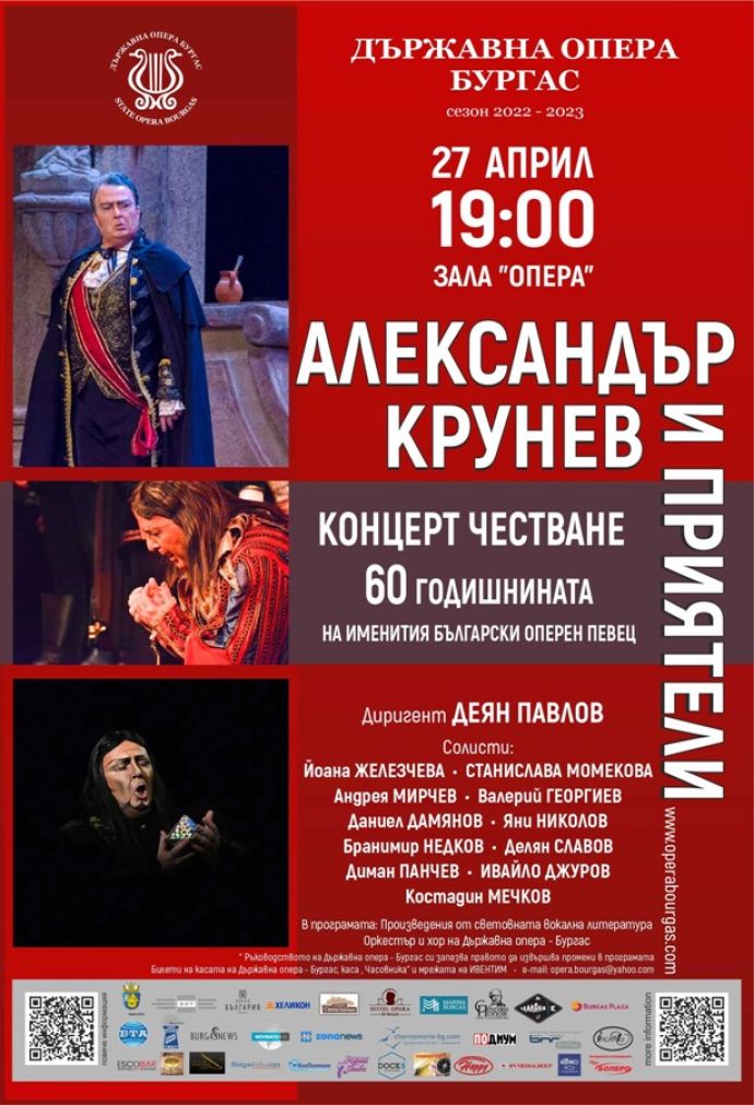 В празничния концерт, посветен на 60-годишнината на именития български баритон Александър Крунев, на 27-и април, четвъртък, от 19 часа в залата на Бургаската опера богатството на своите тембри и емоционално присъствие в чудесно подбраната музикална програма – в сценично партньорство с големия български певец, ще представят: сопраните Йоана Железчева и Станислава Момекова, тенорите Андрея Мирчев, Валерий Георгиев, Даниел Дамянов и Яни Николов, баритонът Бранимир Недков и басите Делян Славов, Диман Панчев и Ивайло Джуров.