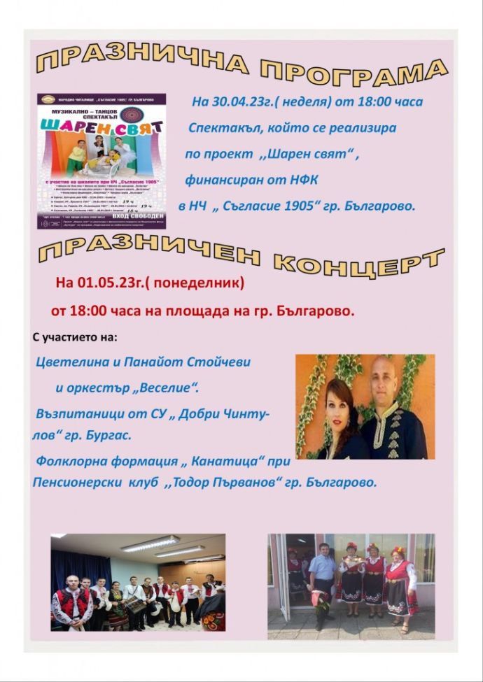 На 01 май, понеделник, отново от 18.00 часа ще се проведе концерт с благотворителен базар от цветя на площада на града. В него ще участват Цветелина и Панайот Стойчеви и оркестър „ Веселие“, възпитаници на СУ „Добри Чинтулов“ – Бургас, фолклорна формация „Канатица“ при ПК „Тодор Първанов“ - Българово.