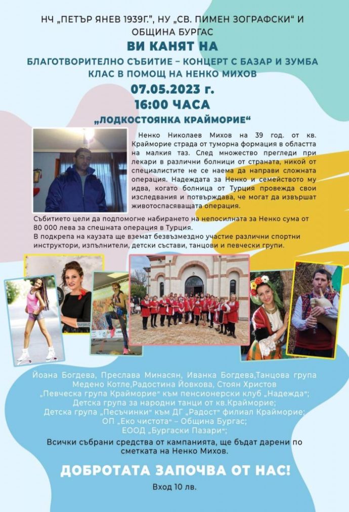 НЧ "Петър Янев 1939 г.", НУ "Св. Пимен Зографски" и Община Бургас организират благотворително събитие в подкрепа на 39-годишния Ненко Михов от квартал Крайморие.