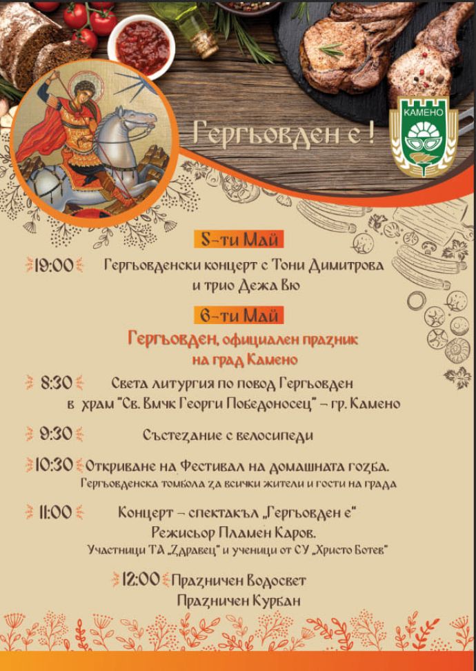 Много изненади очакват жители и гости още сутринта на 6 май, Гергьовден. Празникът на града ще започне 9.30 часа с традиционния велотур. В него ще се включват близо 70 деца в три възрастови групи. Веднага след това в 10.00 часа кметът Жельо Вардунски ще даде официален старт на тържествата, предшествани от водосвет за здраве. И тази година жители и гости на Камено ще се насладят на уникални ястия с Фестивала на домашната гозба. А специални гости ще бъдат реалити звезди и шеф-готвачи.