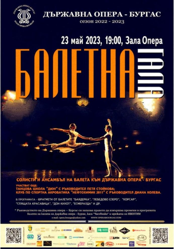 За Държавна опера – Бургас е чест и удоволствие да покани бургаската публика на едно мащабно събитие, което ще представи на наша сцена изявени балетни солисти и танцови формации. Балетната гала, която ще зареди почитателите на изкуството, подчинено на музата Терпсихора, с финес и настроение и ще очарова с вълшебното въздействие на танца, изпълнен с динамика и изящество, залата на Бургаската опера на 23 май, вторник, от 19 часа.