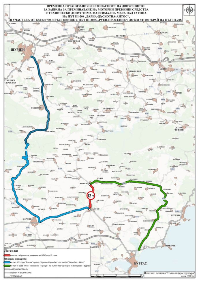 За повишаване на безопасността в Айтос остава ограничено транзитното движение на камиони над 12 т през града, съобщиха от АПИ. От септември 2021 г. е ограничен трафикът в участък от път III-208 Варна – Дъскотна – Айтос и от тогава досега няма тежки пътни произшествия. На интернет страницата на Агенция „Пътна инфраструктура“ – www.api.bg, за едномесечно обществено обсъждане е публикувана проект на заповед за временна организация и безопасност на движението. Тя предвижда да остане въведеното преди близо две години ограничение за транзитното движение на тежкотоварни превозни средства в отсечката от 82-ри км, при кръстовището с третокласен път Руен – Просеник /път III-2085/, след с. Ябълчево, до 94-ти км в град Айтос, и пренасочването им по обходни маршрути.