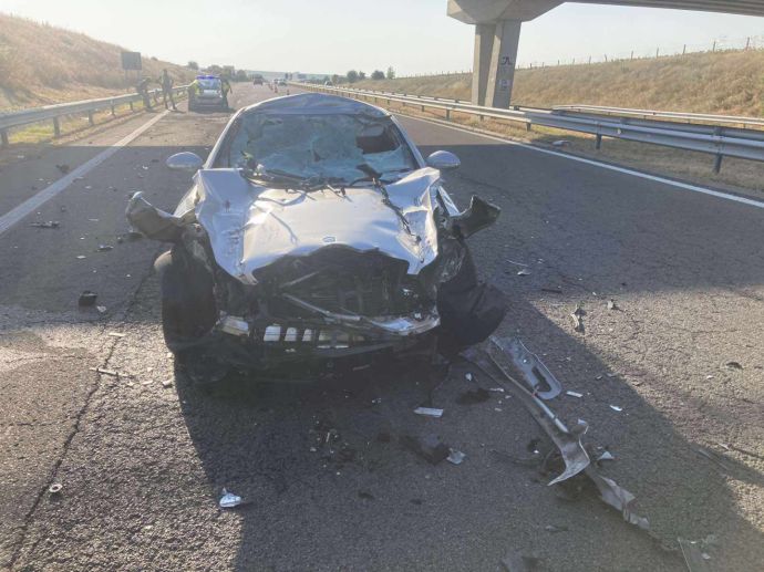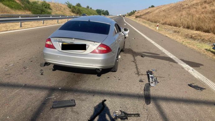 Около 03.45 ч. Днес на автомагистрала “Тракия”, км. 330+900 в посока София, поради движение с несъобразена с интензитета на трафика скорост лек автомобил “Мерцедес CLS 330”, с чуждестранна регистрация, управляван от 46-годишен мъж от Павликени, с който се превозвали още един мъж и жена, застига и се блъска в задната част на камион “Зил”, собственост на Министерство на отбраната. От пътния инцидент в УМБАЛ Бургас са откарани водачът на Мерцедеса и неговите спътници, които с общи наранявания по главата и тялото, са прегледани и освободени за домашно лечение.