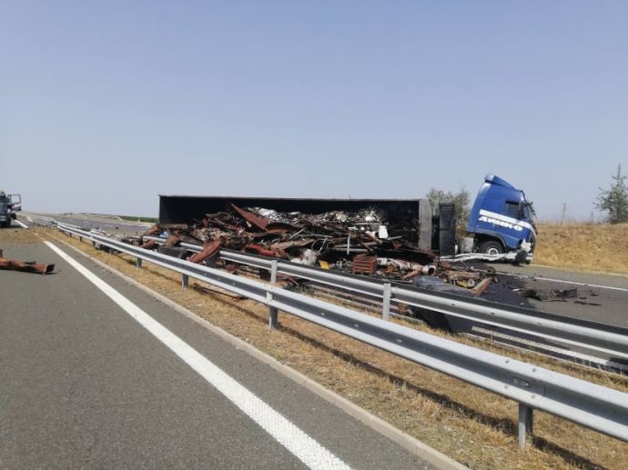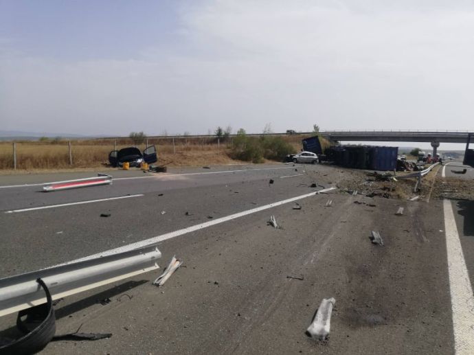 Автомагистрала Тракия, в частта от пътен възел Карнобат до пътен възел Стралджа, в посока София, е затворена, поради възникнал пътен инцидент. Около 09.23 ч. днес, по време на движение се пука гума на товарен автомобил, превозващ скрап. Той е пътувал в посока Бургас и водачът му губи контрол над МПС. Късайки двете средни предпазни мантинели, блъска три леки автомобили, пътуващи в посока София, след които се преобръща напреки на пътното платно.