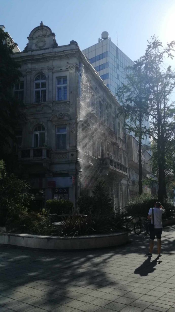 Вода като от водопад бликна от покрива на сграда на централната улица "Александровска" в Бургас. Пръските окъпаха хората в изключително оживения район, където се намират много търговски обекти, а в близост е и входа на НАП. Въпреки това минувачите с усмивка си правеха селфи на импровизирания водопад.