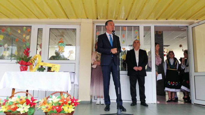 Днес съм тук да поощря и похваля Вашето ръководство, лично директора Георгиев, който за последните 6 години с упоритост направи така, че децата в това училище се увеличиха буквално двойно, което показва, че когато има хъс, желание и енергия за работа, могат да се получават нещата в Бургас. Именно заради това, заради добрия мениджмънт, заради подготовката на добри проекти, след по-малко от месец тук започва голям проект по цялостна модернизация и реконструкция на учебната база. Всички класни стаи, всичко ще бъде ремонтирано, дворното пространство, пет нови асансьора ще бъдат изградени, тоалетни.“, каза кметът Димитър Николов.