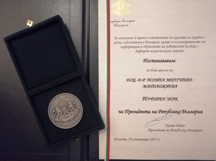 На тържествена церемония доц. д-р Полина Милушева - Мандаджиева получи почетния знак на президента на Р България Румен Радев. Високото отличие ѝ беше връчено за значимия ѝ принос в отстояването на каузата на хората с редки заболявания в България, както и за осигуряването на информация и обучението на родителите на деца с дефицит на растежния хормон.