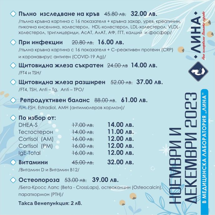 Медицинска лаборатория „ЛИНА“ е първата в страната, която въведе месечни профилактични кампании с грижа за пациента. Те важат във всеки от самостоятелните ѝ филиали в областите: Бургас, Варна, Пловдив, Пазарджик, Стара Загора, Сливен и Ямбол. Таксата венепункция и транспортна среда е 2 лв.