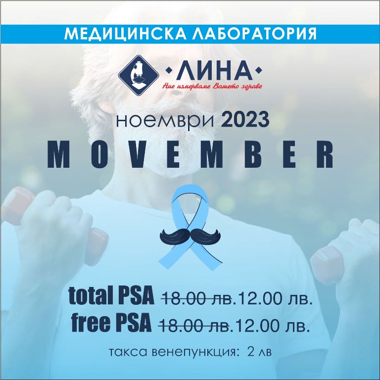 За поредна година лаборатория "ЛИНА" подкрепя популярната кампания MOvember за повишаване на осведомеността за мъжкото здраве и по-конкретно - за рака на простатата. През целия ноември в самостоятелните лаборатории и манипулационни на “ЛИНА” изследванията на общ PSA (total PSA) и свободен PSA (free PSA) ще са на преференциални цени - от 18 лв. на 12 лв. всяко.![]()
