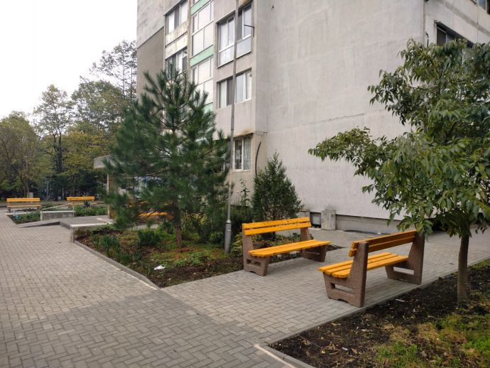 На снимките виждате благоустроено пространство в комплекс „Лазур“, около бл. 75. Всички дейности по проекта са поискани от жителите на сградата и съгласувани няколко пъти с тях. Там са ремонтирани тротоарите. Поставени са нови пейки. Преасфалтиран е подходът към сградата. Обновени са паркоместата.