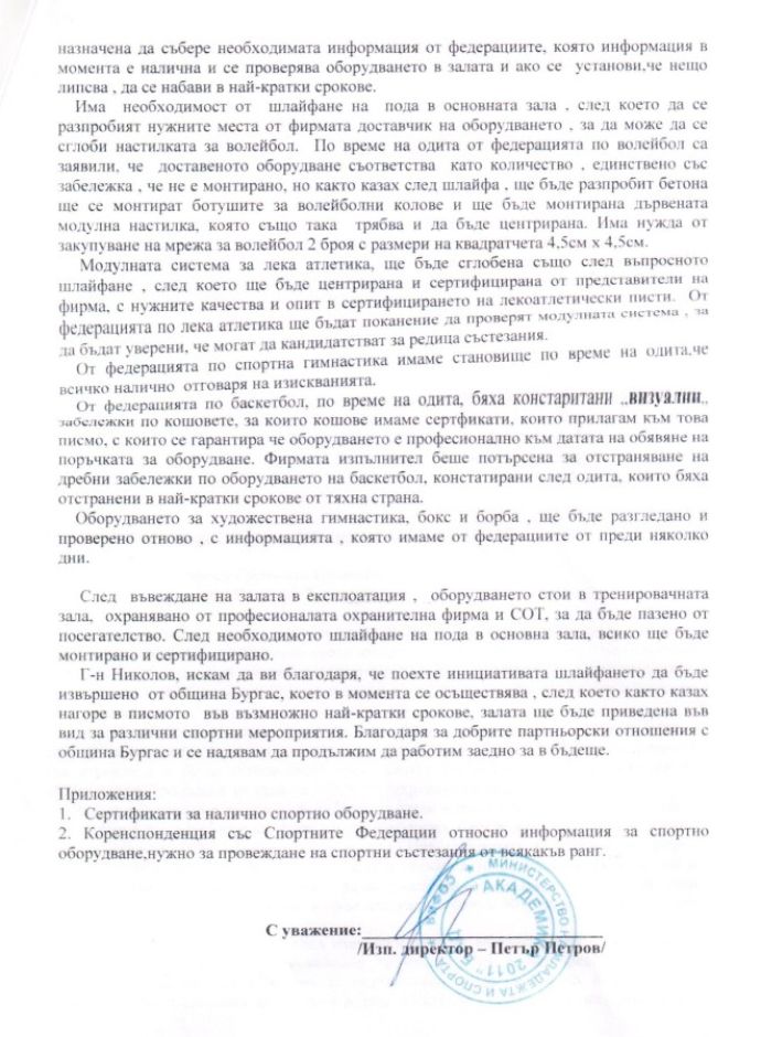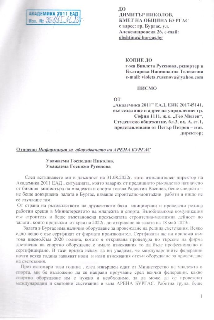 Към писмото от изпълнителния директор на „Академика“ до кмета на Бургас са приложени десетки сертификати на оборудването за различните видове спорт, както и писма от федерациите.
