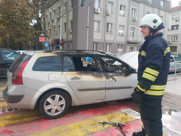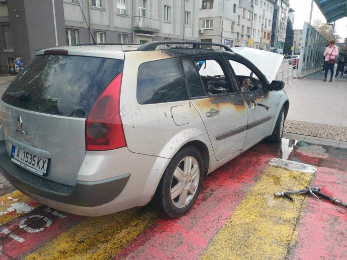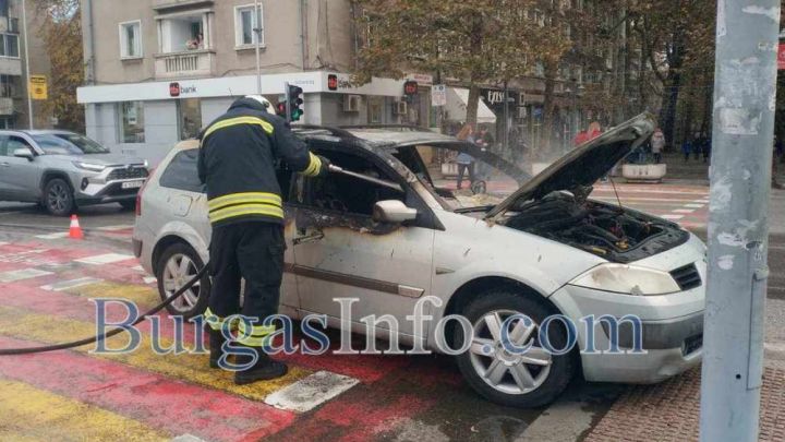 Лека кола "Рено" пламна в движение на пешеходната пътека на бул. "Сан Сстефано" и ул. "Александровска" в центъра на Бургас. На място пристигнаха екипи на полицията и пожарната. Купето на автомобила е напълно унищожено. Пламъците са загасени, но движението в района е затруднено. Водачът на колата не е пострадал, в момента разговаря с полицаите за причината за инцидента.