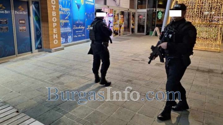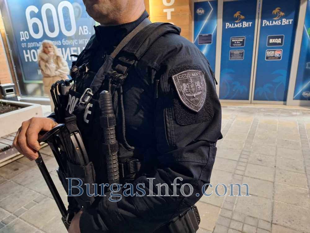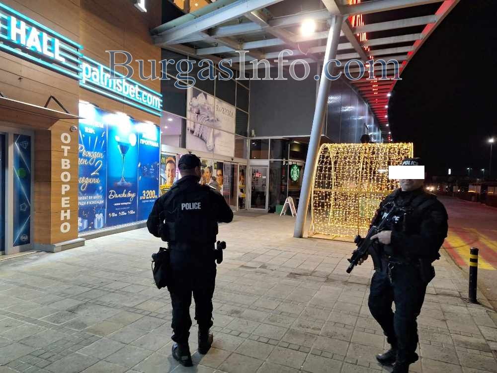 Служители от сектор „Специалните тактически действия” патрулираха тази вечер пред мол „Бургас плаза”.