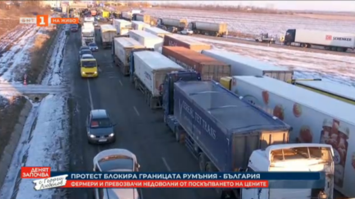 Десетки румънски трактори и камиони блокираха снощи напълно граничния пункт с България при Калафат и обещаха да се върнат да протестират и днес.