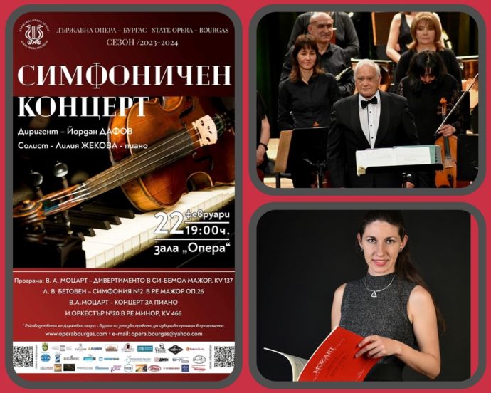 Поредното събитие на Държавна опера – Бургас за м. февруари, е концерт, който заслужава вниманието на почитателите на симфоничната музика. Под палката на изтъкнатия диригент Йордан Дафов, който преди дни навърши достолепната възраст от 84 години, ще бъде представена разнообразна концертна програма, подбрана с усет и вкус, на Симфоничния концерт на 22 февруари, четвъртък, от 19 часа в залата на Бургаската опера. Доайенът в българското културно пространство маестро Дафов е зареден с неизчерпаема творческа енергия и да продължава да бъде еталон за класа. Всяко музикално събитие под неговата палката се превръща в незабравимо естетическо преживяване. Коледният концерт под неговото диригентство – в края на м. декември мин. год., в който участваха над 150 изпълнители на сцената – оркестър, хор, Детски хор "Милка Стоева", танцьори от ПФК "Странджа", изпълни залата на Бургаската опера с емоционална публика и се превърна в събитие с широк обществен отзвук.