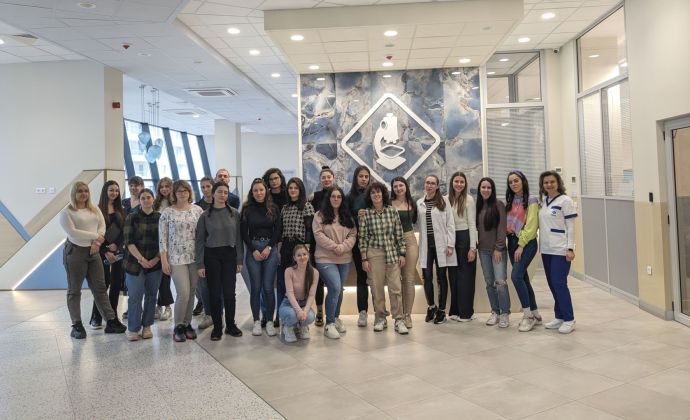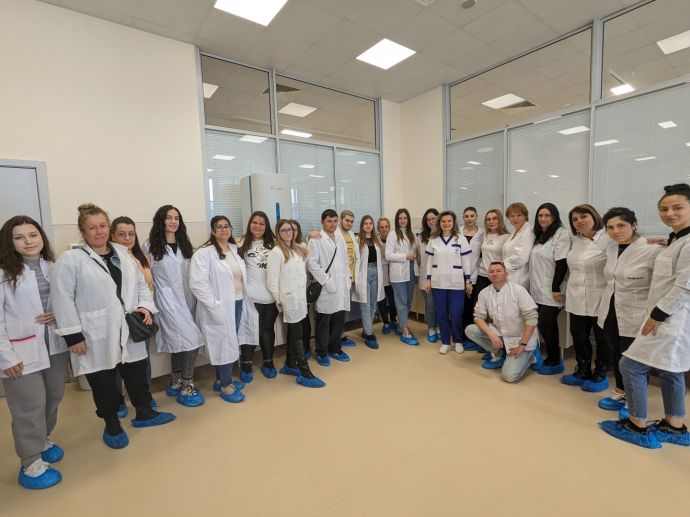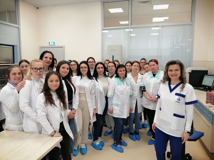 Студентите от специалностите „Медицинска сестра“ и „Акушерка“ през първия семестър посетиха клиничната лаборатория на „ЛИНА“, а сега, през втория, са в микробиологичната. Доц. Михайлова обясни на специалистите по здравни грижи как се вземат и транспортират пробите за микробиологично изследване. Тя подчерта, че преданалитичният етап е гаранция за надеждност на лабораторния резултат и медицинските сестри и акушерките имат ключова роля при взаимодействието между пациента, лекуващия лекар и лабораторията.![]()
