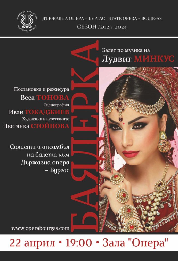 На 22 април, понеделник, от 19 часа на сцената на Държавна опера – Бургас балетната класика „Баядерка“ по музика на Лудвиг Минкус ще представи оригинален и вълнуващ прочит на драматичната любовна история – постановка и режисура на Веса Тонова, дългогодишната примабалерина на Софийска опера и балет, балетен режисьор и педагог.