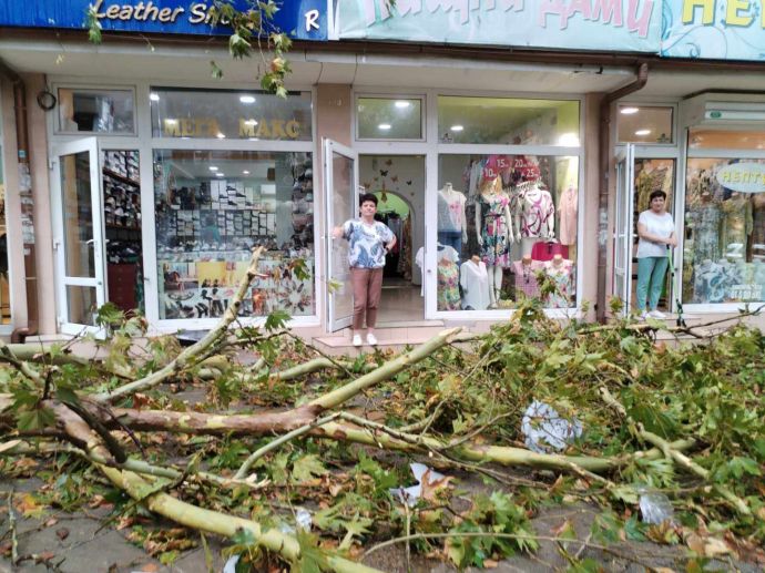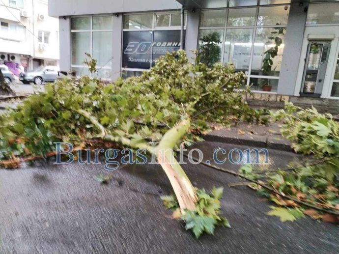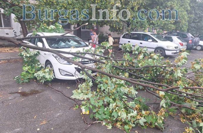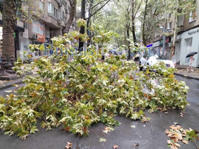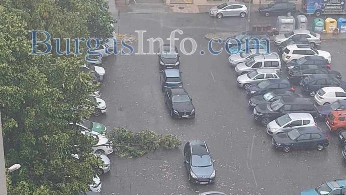Буря със силен вятър, дъжд и гръмотевици премина за 10-ина минути през Бургас. След продължителната жега през последните седмици, небето почерня, а вятърът събори клони и разхвърли листа и боклуци. Хора тичаха да спасяват прането си и да затварят прозорци. Силен гръм стресна жителите в района на входа на Бургас откъм АМ „Тракия“.