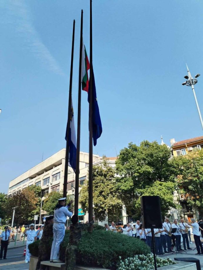 Тържествените ритуали започнаха на площад „Атанас Сиреков“ с издигане на националния флаг на Република България и флаговете на Европейския съюз и на Община Бургас.