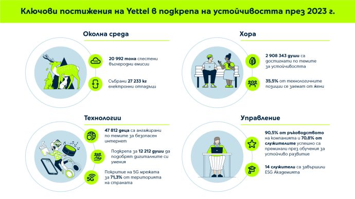 Данните са от публикувания днес Доклад за устойчиво развитие на Yettel за 2023 г., който отразява напредъка и постиженията на компанията в четирите стратегически области – околна среда, хора, технологии за устойчиво бъдеще и управление, основано на почтеност и прозрачност.