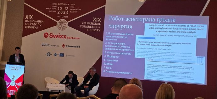 Националният конгрес по хирургия, който се проведе от 10-12 октомври в столицата, събра водещи хирурзи от цялата страна. Сред основните теми на конференцията бяха робот-асистираната и минимално-инвазивната хирургия, които привлякоха вниманието на специалисти и участници. Отделението по гръдна хирургия, ръководено от д-р Недялко Драгнев, изнесе два доклада, свързани с робот-асистираната хирургия и трахеалното стендиране.