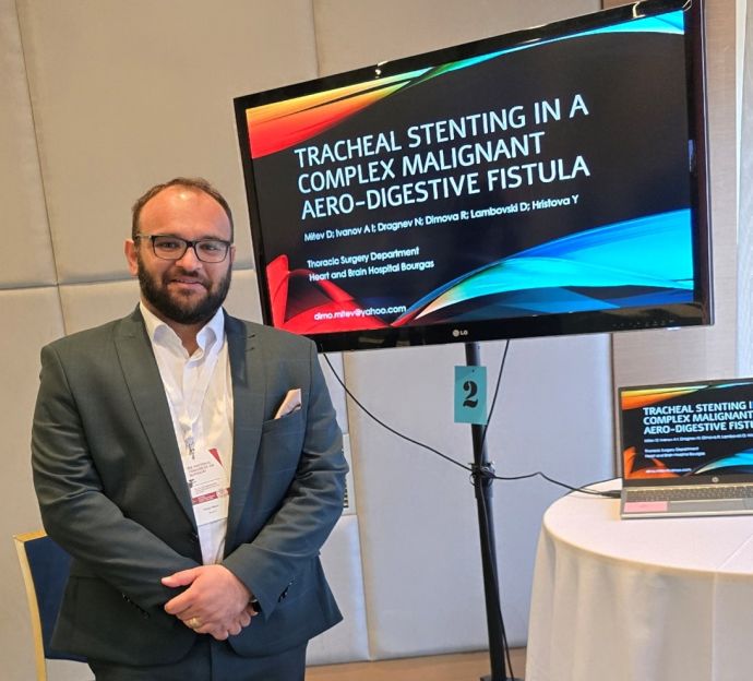 Във втория ден на конференцията беше засегната темата за трахеалното стентиране при комплексни фистули при рак на хранопровода – жизнено необходима процедура при пациенти с локално авансирал крацином. Д-р Димо Митев, хирург със солиден опит при минимално-инвазивни оперативни интервенции, представи новите подходи и техники за стентиране на трахеята. Той акцентира върху значението на персонализирания подход, прилаган при избора на тип стент и техниката на поставяне. Д-р Митев коментира и новите материали и технологии, използвани при стентиране на дихателните пътища, чиито предимства са значителното намаляване на риска от миграция на стента и други усложнения. Специалистът представи и случаи на пациенти, получили значително облекчение след процедурата. Опитът на специалистите от високотехнологичния болничен комплекс потвърждава, че трахеалното стентиране подобрява качество на живот и дава възможност за продължаване на онкологичното лечение.