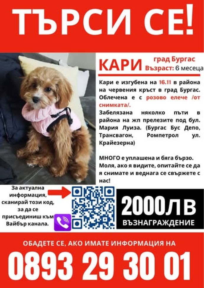 Стопаните на кученцето Кари от Бургас обявиха солидната награда от 2000 лева за този, който я намери и върне у дома й. Седми ден хората неуморно търсят следи от домашния си любимец, който изчезна миналата седмица. Съдбата на Кари развълнува стотици хора, много от тях се включиха в търсенето й, като следите бяха ту достоверни, ту подвеждащи.