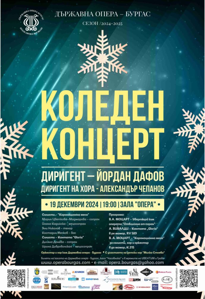 В навечерието на Коледа, символ на стремежа към повече хармония и обич във взаимоотношенията, Държавна опера – Бургас е подготвила традиционния Коледен концерт, под палката на доайена в родното културно пространство – Йордан Дафов, носител на наградата "Златен век" на Министерството на културата. Уважаваният диригент е сред изявените дейци, отличени за приноса си в развитието на културата и утвърждаването на националната идентичност. Маестро Дафов продължава да е изключително енергичен, прецизен и вдъхновяващ оркестрантите и публиката със своя изискан индивидуален поглед върху партитурите и лична харизма, която обединява музикалните идеи и ги вплита в единно естетическо внушение. На 19 декември, четвъртък, от 19 часа в залата на Бургаската опера Йордан Дафов застава зад диригентския пулт на празничния концерт, в който ще вземат участие солисти, оркестър – с концертмайстор Ваня Златева, и хор – с диригент Александър Чепанов, както и младите таланти от Детски хор „Милка Стоева“. Хор „Милка Стоева“ е носител на традициите на дългогодишна хорова школа, с поредица от впечатляващи национални и международни изяви и е носител на престижни награди през годините. През летния сезон на т. год. децата от гора участваха в представлението на „Тоска“ в Летния театър. Те са чест и желан гост в концертни прояви и постановки на Бургаската опера – като символ на приемственост в изкуството.