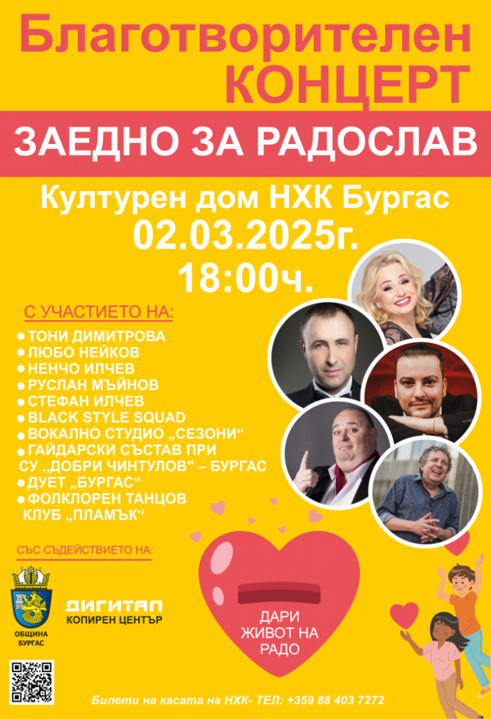 Благотворителен концерт „Заедно за Радослав“ ще се проведе на 2-ри март от 18.00 часа в Културен дом НХК.На една сцена ще излязат някои от най-големите български звезди: Тони Димитрова, Любо Нейков, Ненчо Илчев, Руслан Мъйнов и Стефан Илчев. На Радослав ще помогнат и музикалните групи: Вокално студио „Сезони“, Гайдарски състав при СУ ,,Добри Чинтулов", Дует „Бургас“, както и танцувалните групи: Black Style Squad, Фолклорен танцов клуб „Пламък“.