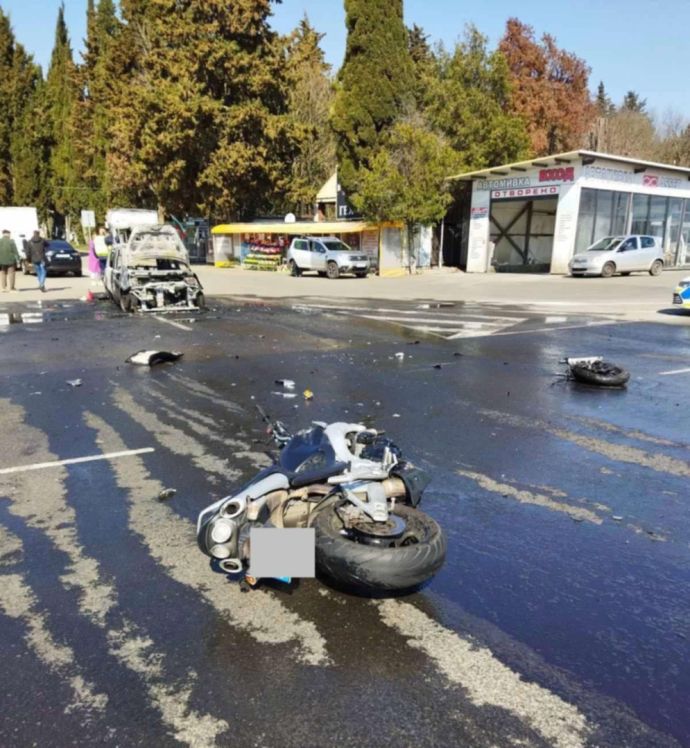 Инцидентът е станал в 09.20 ч. между лек автомобил "Нисан", с бургаска регистрация, извършващ ляв завой от бул. "Димитър Димов" в посока Гробищата и правомерно движещ се в права посока, но с несъобразена скорост мотоциклет "Сузуки", с бургаска регистрация, управляван от водач с двойно гражданство - българско и турско. От удара автомобилът се запалва, а мотоциклетистът във видимо тежко състояние е откаран болница.