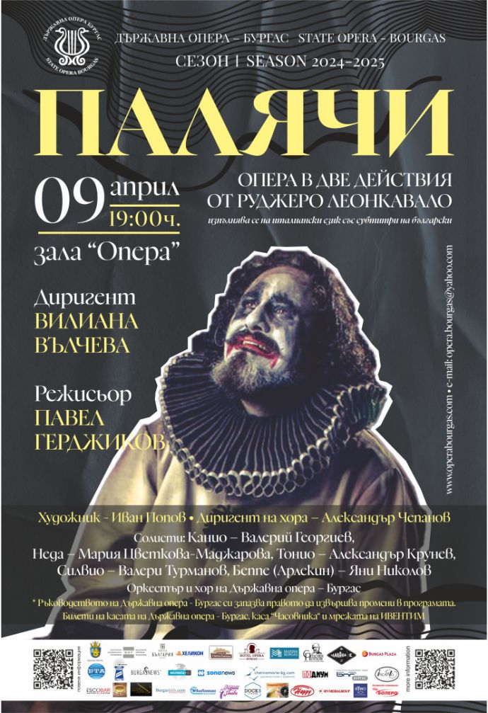 На 9 април, сряда, от 19 часа, на сцената на Бургаската опера, под палката на харизматичната Вилиана Вълчева – гост-диригент от Държавна опера – Русе, със забележителна професионална биография, дирижирала по престижни световни сцени, сопраното Мария Цветкова-Маджарова, тенорът Валерий Георгиев, баритоните Александър Крунев и Валери Турманов, както и тенорът Яни Николов, заедно с артистите от хоровия състав и музикантите от оркестъра на Държавна опера – Бургас, ще представят операта „Палячи“ от Руджеро Леонкавало. Режисурата на сложния драматичен спектакъл, характерен с дълбок психологизъм при изграждането на образите – с вплетени фаталистични елементи, е проф. Павел Герджиков, който от година вече не е сред нас, но неговият дух и послания продължават своя сценичен живот.