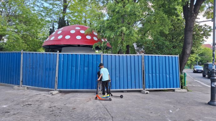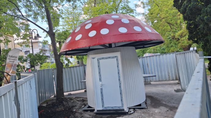 Новата „Гъбка“ зае мястото си на входа на Морската градина в Бургас днес, след като вчера старият овехтял павилион беше премахнат. Още първите часове тя прикова вниманието на мнозина минувачи, които любопитно я оглеждаха през загражденията.