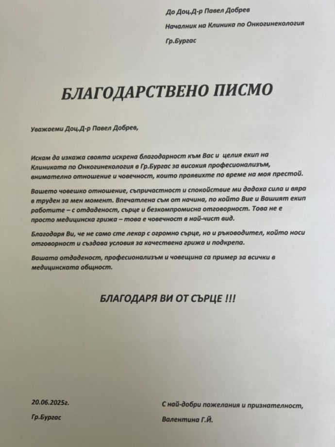 Вашето човешко отношение, съпричастност и спокойствие ми дадоха сила и вяра в труден за мен момент.“. С тези топли думи се обръща към началника на Клиниката по онкогинекология към КОЦ-Бургас доц. Д-р Павел Добрев благодарната пациентка Валентина Г. Й. Тя изразява своята признателност към медиците в момент, който е изключително важен за всеки пациент, в който всеки има остра нужда както от качествени здравни грижи, но и от разбиране и подкрепа.