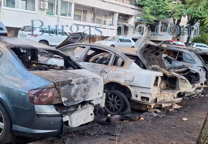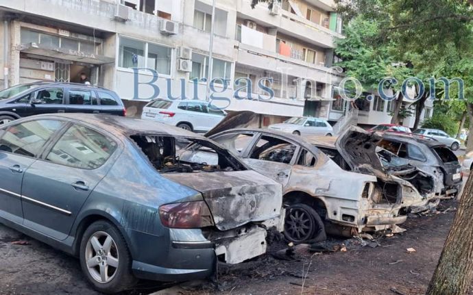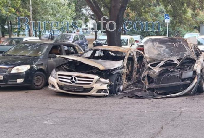 В 02.41 ч. пък в Пето Районно управление – Бургас снощи е получено съобщение за горящи автомобили, паркирани пред вх. 6 на бл. 55 в ж.к. "Изгрев". Установено е, че е запален "Мерцедес CLS 260", с бургаска регистрация, като огънят обхванал и изпепелил паркираните в съседство "Фолксваген Пасат" и "Пежо 407". С частично обгаряне по броните и фаровете са и четири паркирани в близост леки автомобили. Огънят е потушен от два противопожарни автомобила и четирима огнеборци. Процесуално-следствените действия и по двата случая продължават, а причините за извършените палежи са в процес на изясняване.
