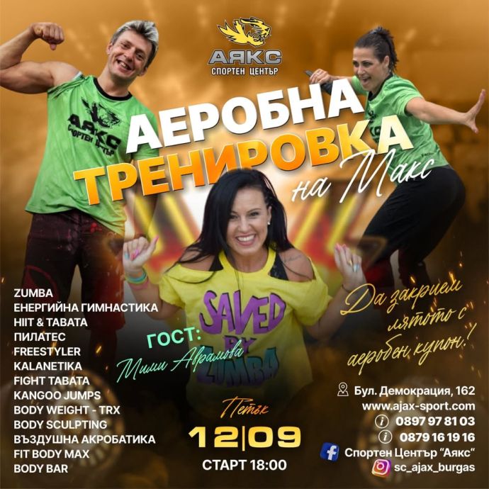 Топ кип от квалифицирани и известни инструктори ще представят и ще водят тренировка по най-популярните аеробни спортове на спортен фест, който предстои в Бургас. Той ще се проведе на 12-и септември в Спортен център „Аякс“. Ще има специална спортно-забавна програма, изненади, награди, които ще дадат енергия и много настроение на всеки дошъл в рамките на 2 часа. Така включителите се в тренировката ще имат възможността да се докосне до най- атрактивни аеробни спортове, предлагани в града.