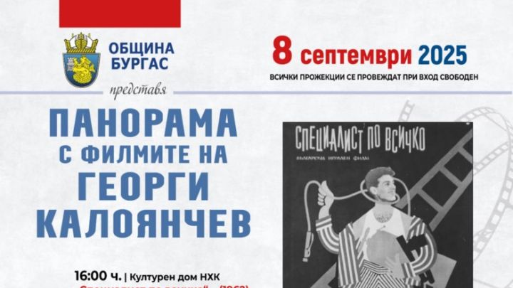 Фестивалът на смеха и комедията "Калата" и програмата посветена на 100 години от рождението на големия български актьор, родом от Бургас,Георги Калоянчев продължава с панорама с филмите му на 8 септември. Зрителите ще могат да видят два от емблематичните му филми, в които си партнира с друг велик бургазлия Апостолов Карамитев - "Любимец 13" и "Специалист по всичко". Част от програмата са и филмите "Езоп" и "Инспекторът и нощта". Тези четири филма публиката може да види в Културен дом НХК. Всички прожекции са при вход свободен.