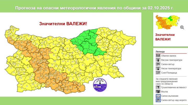 По данни на Националния институт по метеорология и хидрология се очаква силен вятър: скорост 14-19 m/s (50-69 km/h) и/или пориви до 24 m/s (90 km/h) и количество валежи: 20-35 mm за 24 часа или интензивен валеж – до 30 mm за 6 часа