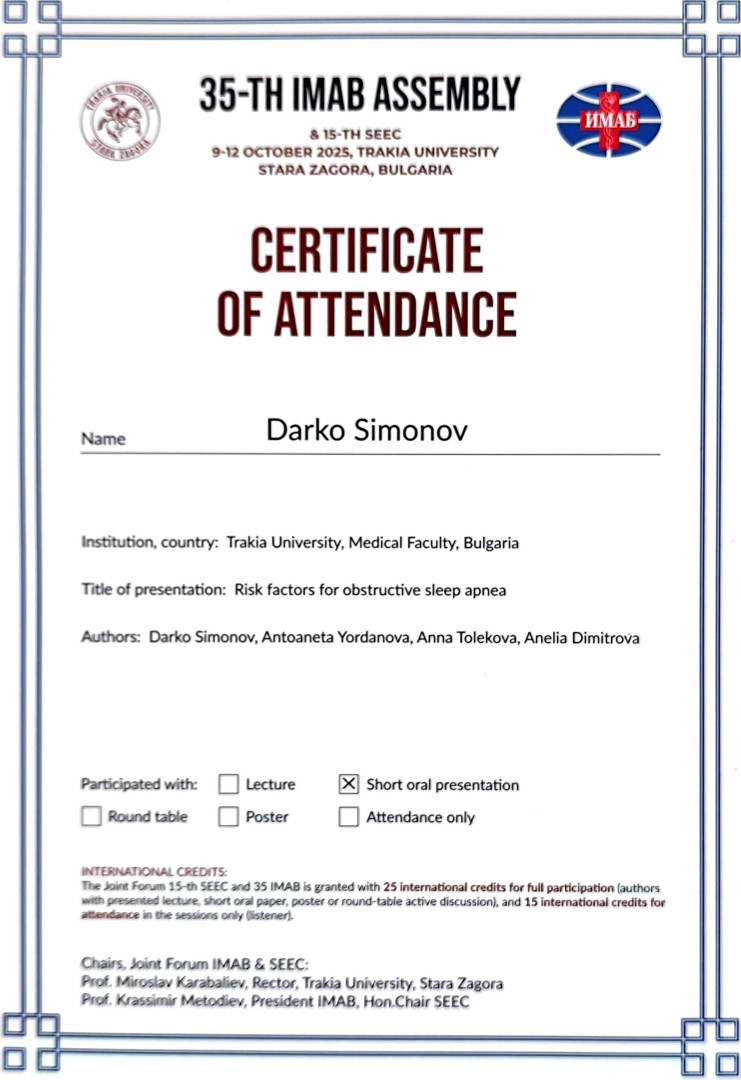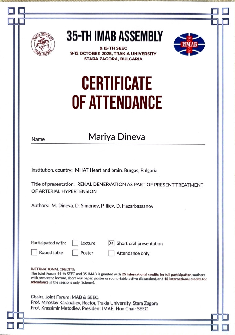 Кардиолозите на ,Сърце и Мозък’ – д-р Дарко Симонов и д-р Мария Динева изнесоха доклади на тема - ,,Ренална денервация" и ,,Рискови фактори при обструктивна сънна апнея". Докладите им съдържаха есенцията от дългогодишната работа на специалистите от клиниката по кардиология, свързана с приложението на най-съвремените методи за диагностика и лечение на неконтроилираното артериално налягане. Техните трудове, както и останалите представени изследвания, ще бъдат публикувани в специалното извънредно издание на Journal of IMAB – Supplement J.IMAB 2025.