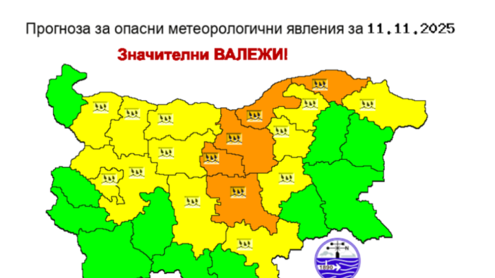 Днес е обявен оранжев и жълт код за значителни валежи. Предупреждението е в сила за 17 области в страната. В областите Силистра, Русе, Стара Загора, Габрово и Пловдив е обявен предупредителен оранжев код за опасно време. За останалите 12 области е в сила жълт код за потенциално опасно време. Това са областите Добрич, Разград, Търговище, Сливен, Хасково, Пловдив, Ловеч, Плевен, Враца, Монтана, София-град и София област.