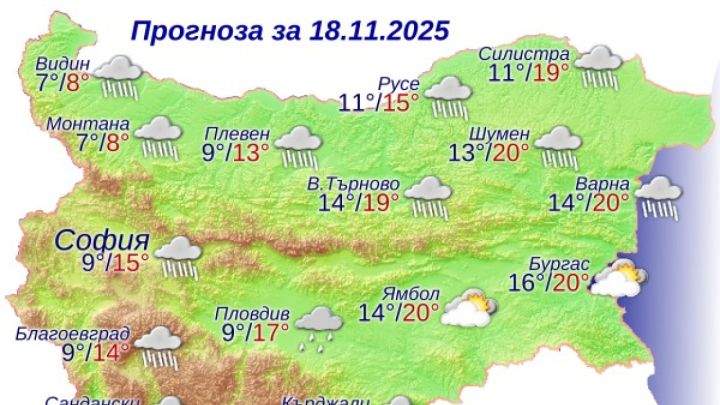 Очаква се утре времето да бъде облачно с валежи, основно в Северна и Западна България, като дъждът ще продължи и през нощта срещу сряда.