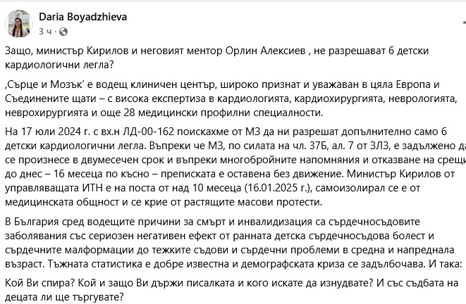„Защо, министър Кирилов и неговият ментор Орлин Алексиев не разрешават 6 детски кардиологични легла в ,Сърце и Мозък’?